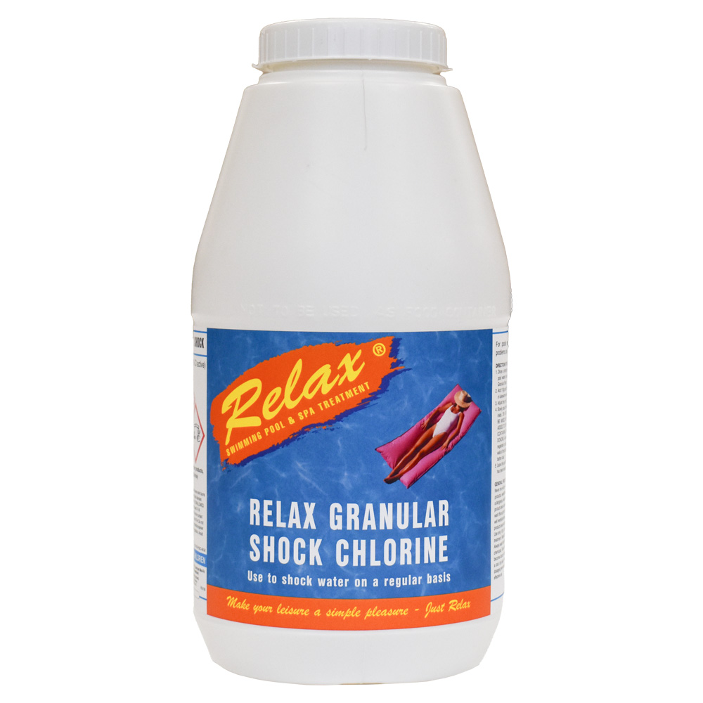 Relax Granular Shock – A traditional shock treatment product, these calcium hypochlorite granules have an available chlorine level of on average 70% making them a good chlorine donor for pool water problem solving.